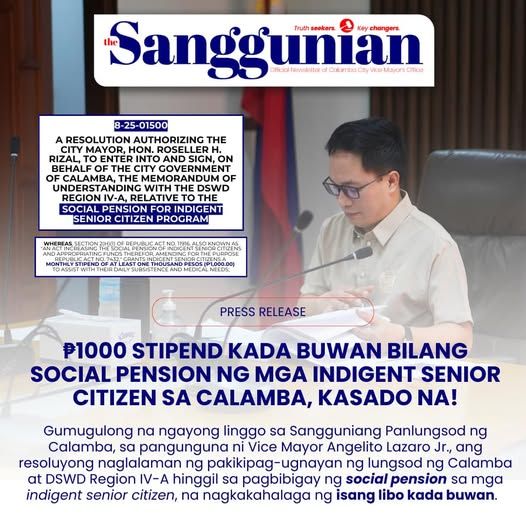 "Binabasa na ngayong linggo sa sesyon ang pagbibigay-mandato kay Calamba City Mayor Roseller H. Rizal para lagdaan ang Memorandum of Understanding sa pagitan ng Department of Social Welfare and Development (DSWD) Region IV-A at ng lungsod ng Calamba hinggil sa social pension ng mga indigent senior citizen ngayong taon," ani Lazaro, na siya ring presiding officer ng Sangguniang Panglungsod.